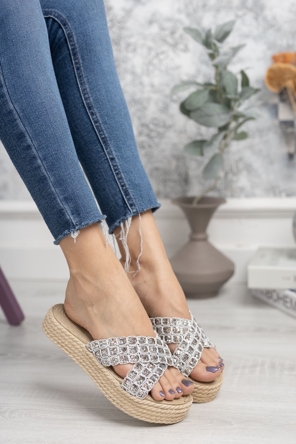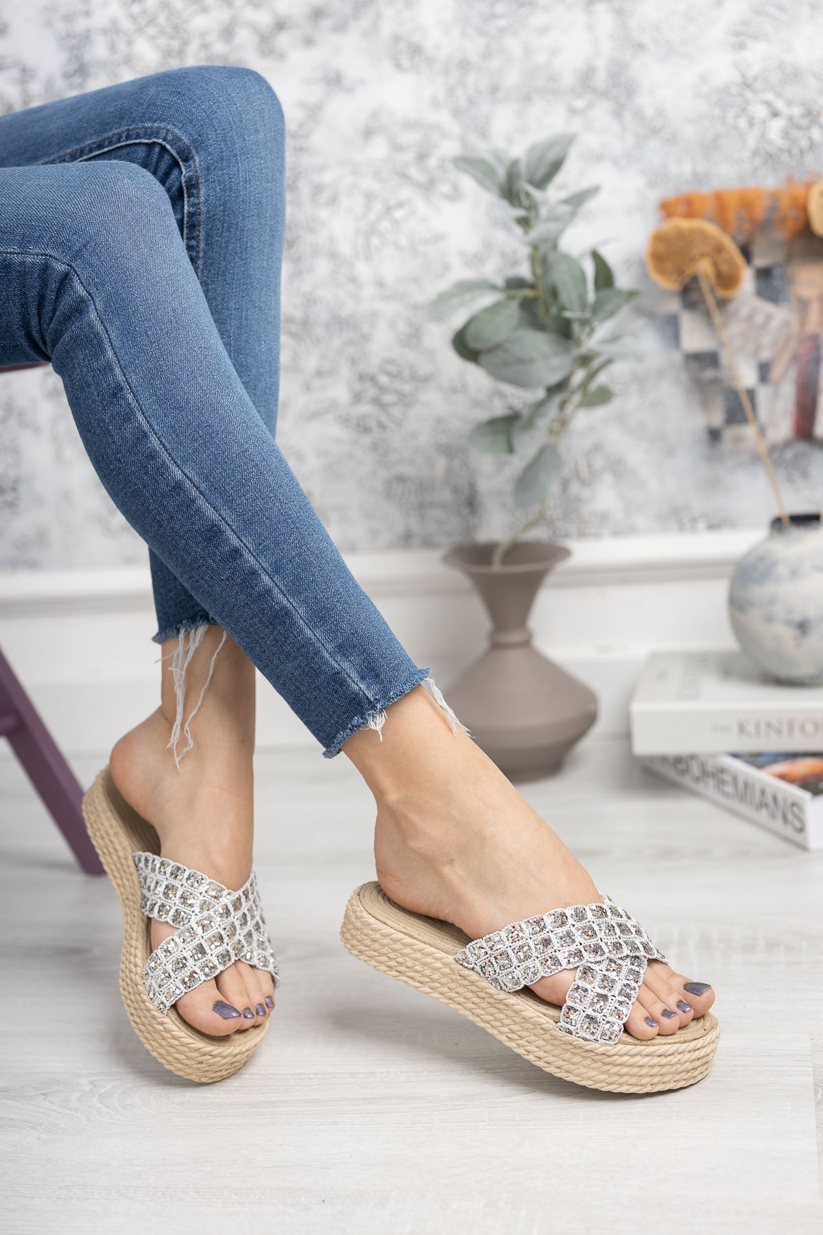 Çapraz Bant Beyaz Taşlı Terlik