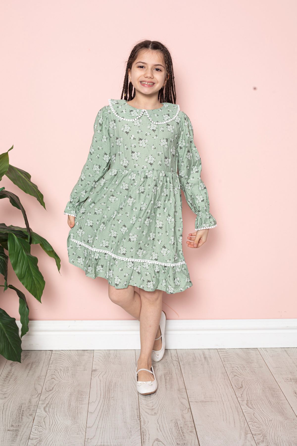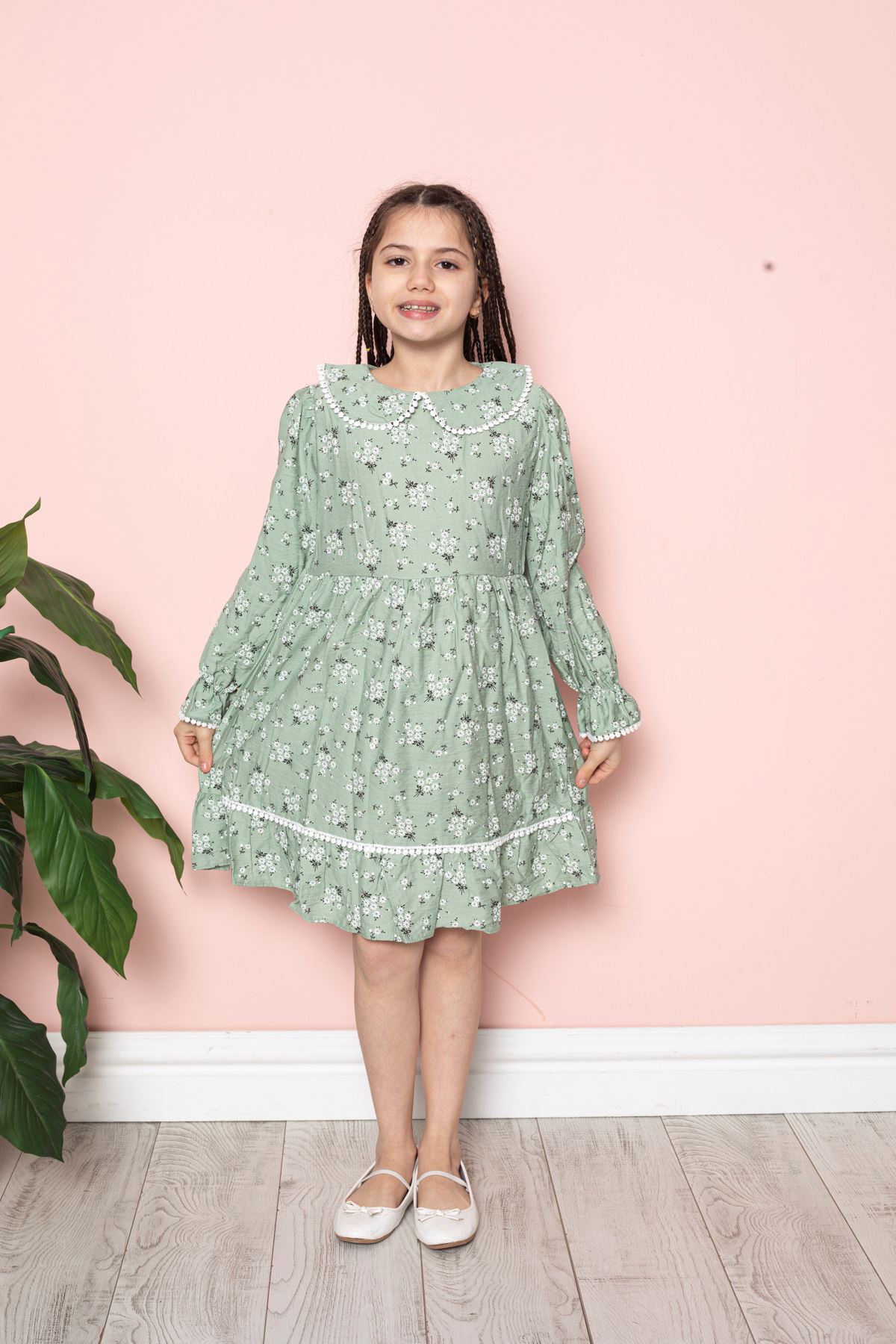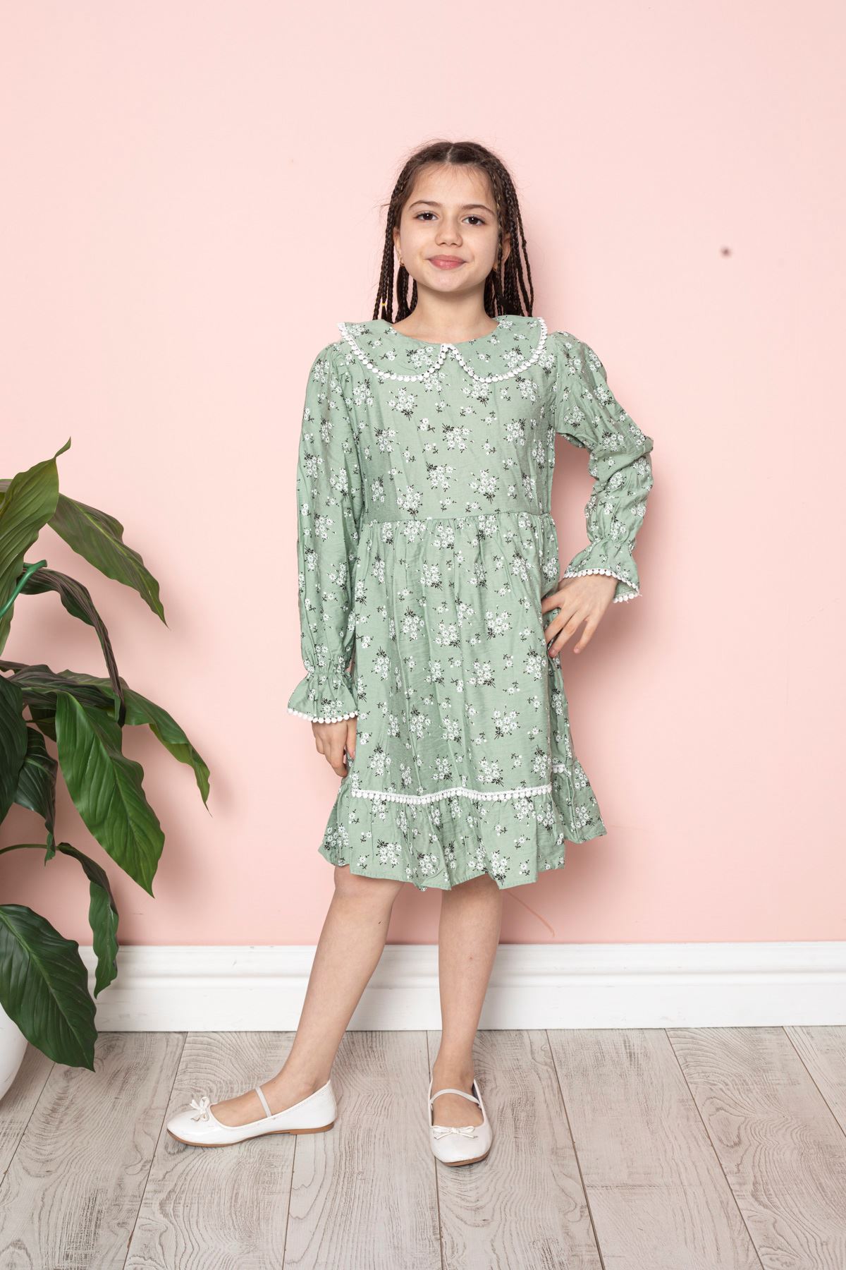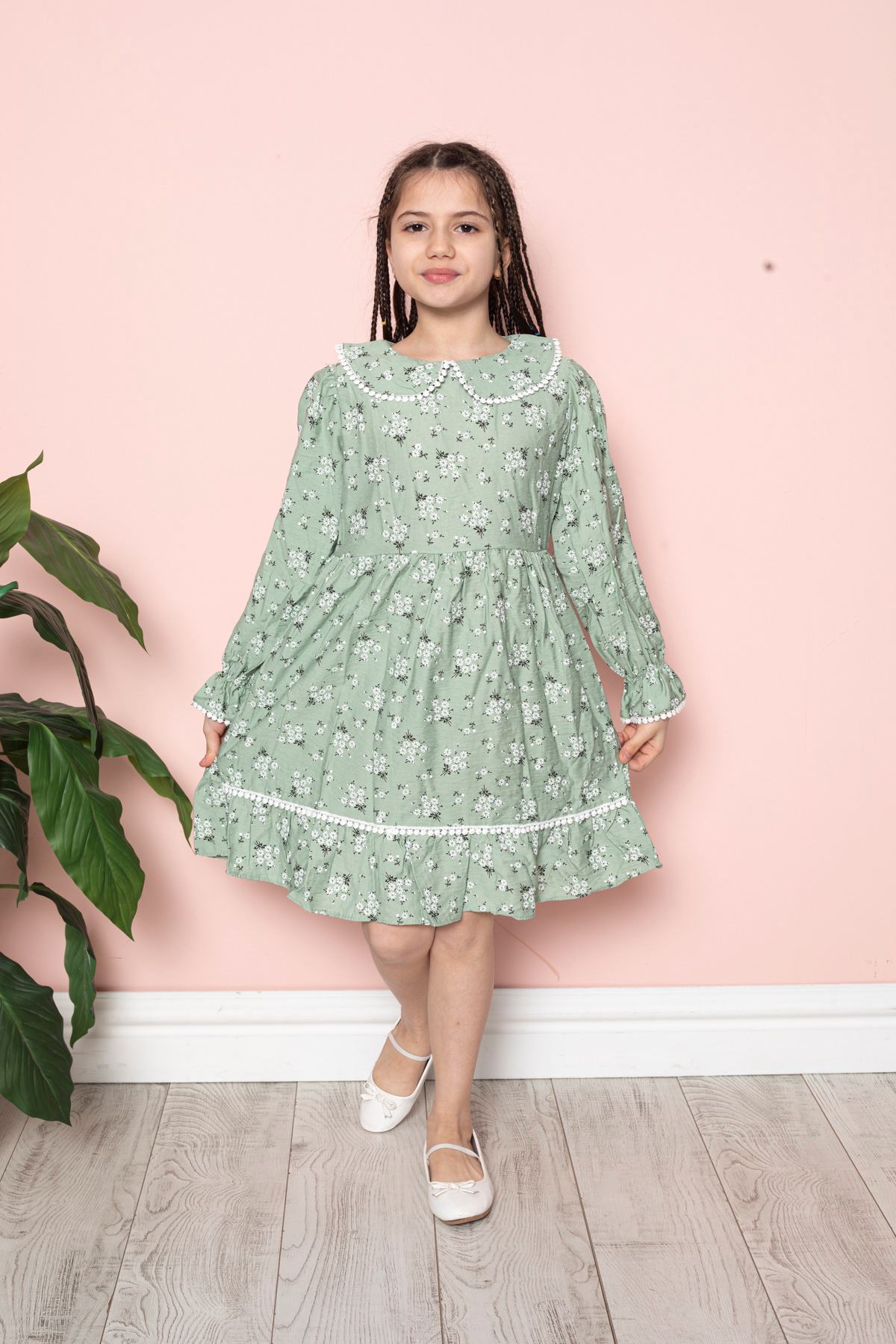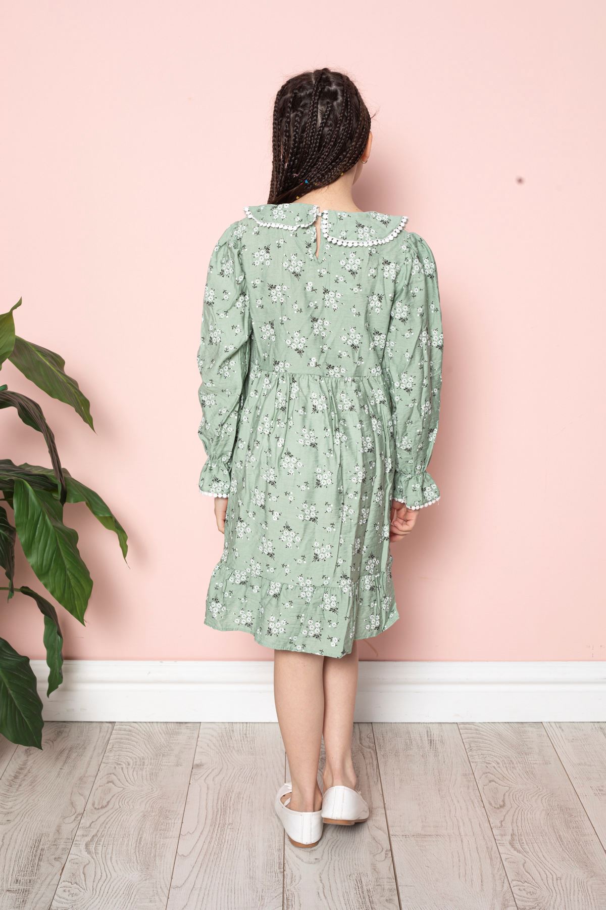 Çiçek Baskılı Bebe Yaka Kız Çocuk Elbise