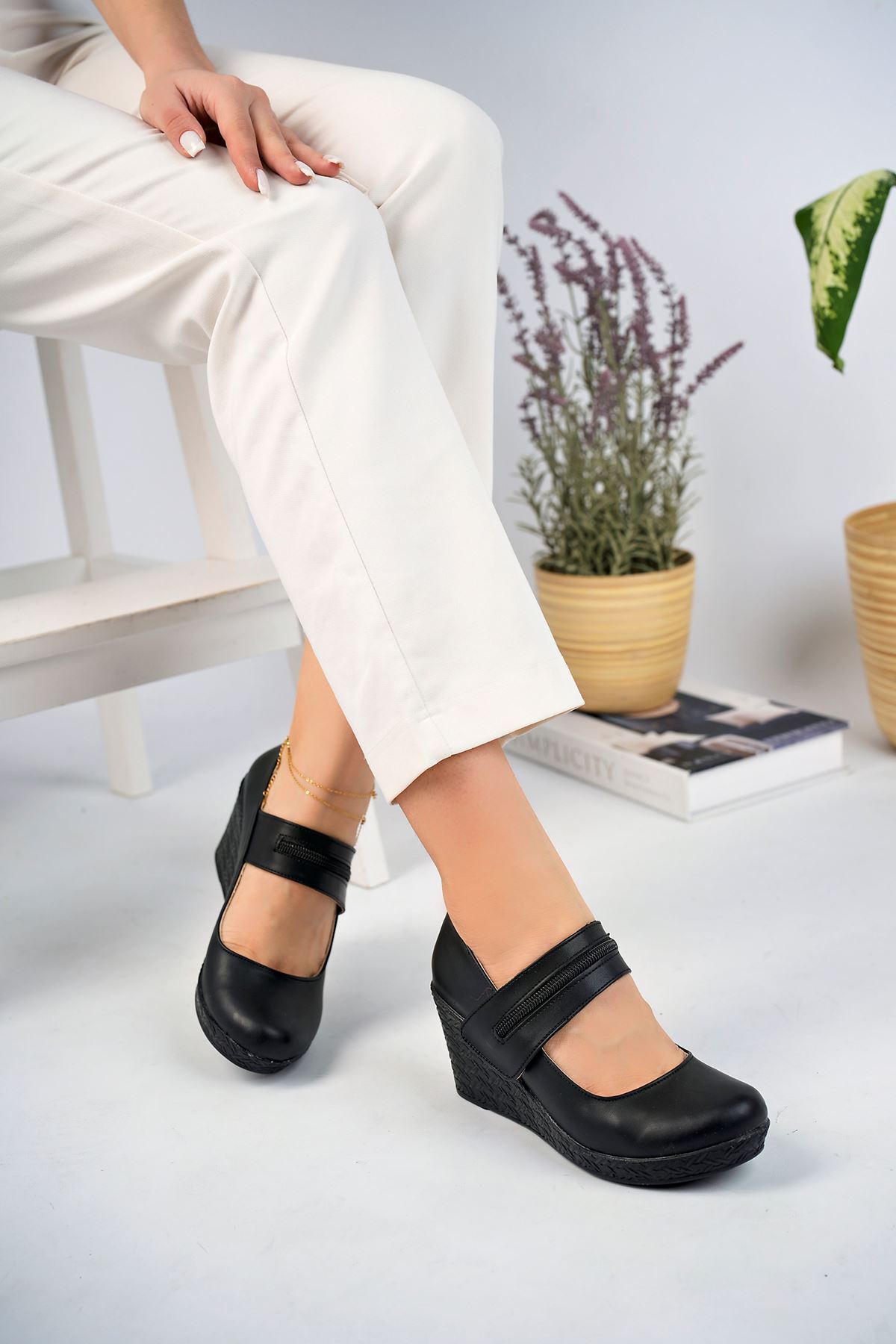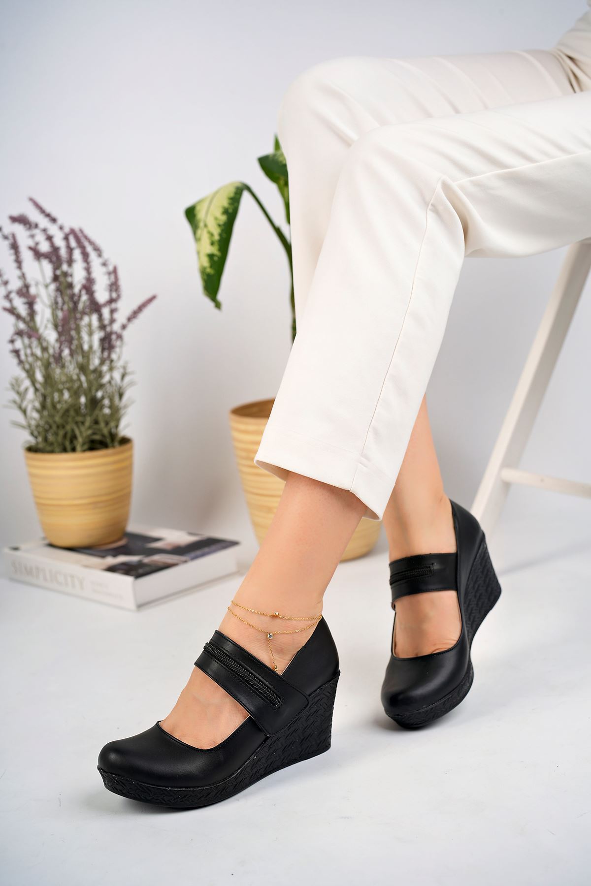 Dolgu Taban Fermuar Detaylı Cırtlı Siyah Cilt Ayakkabı