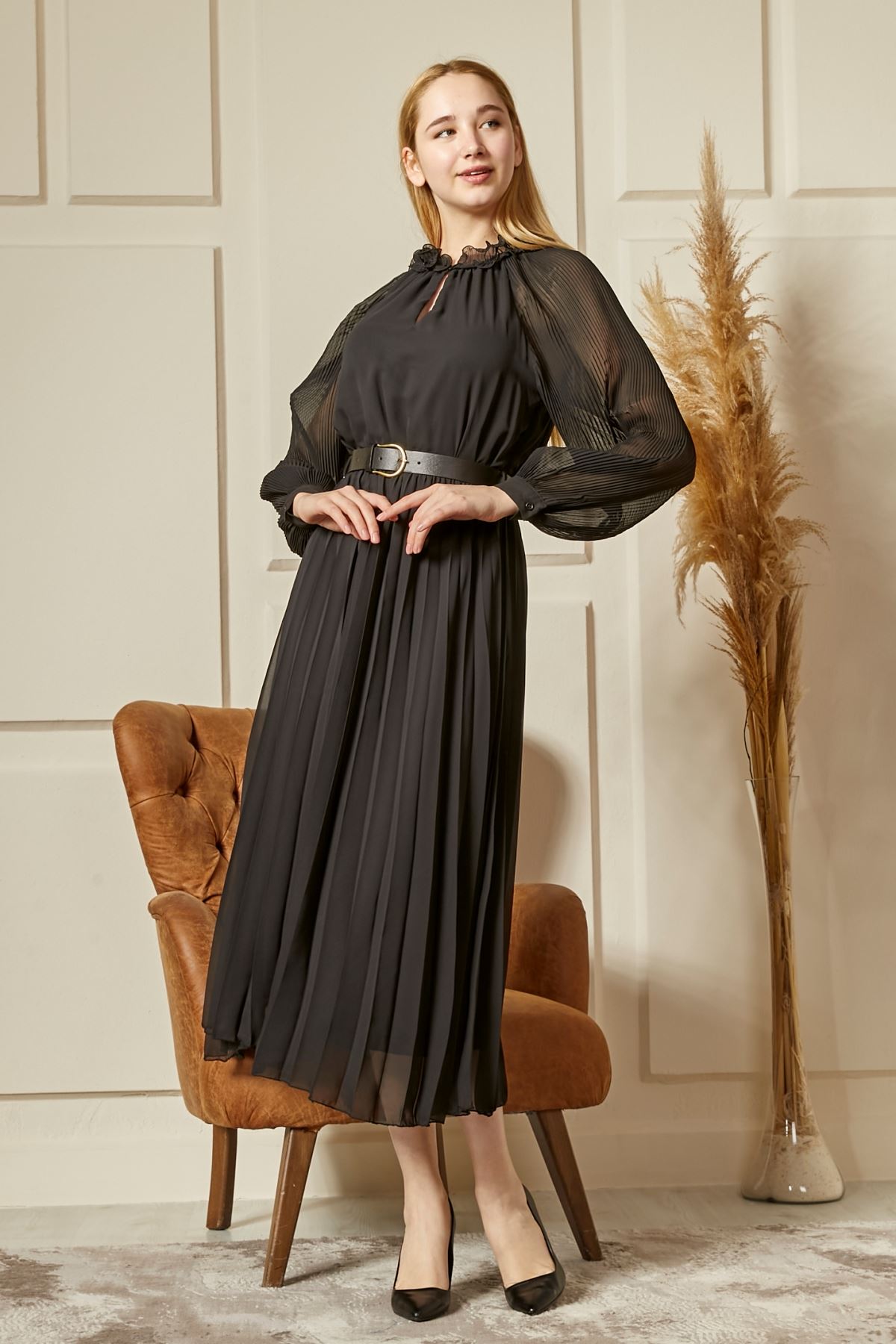 Kemerli Piliseli Şifon Kadın Elbise